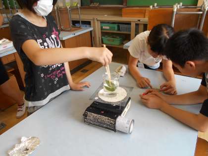 ガスコンロを使って、葉がやわらかくなるまで煮て、ヨウ素液につけ、ヨウ素でんぷん反応があるかないかを確かめました。どのグループも、安全に気をつけながら手際よく実験を進めることができました。