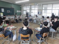 今年度最後の給食は、みんなで輪になって食べました。いつもとは違った並び方で食べる...