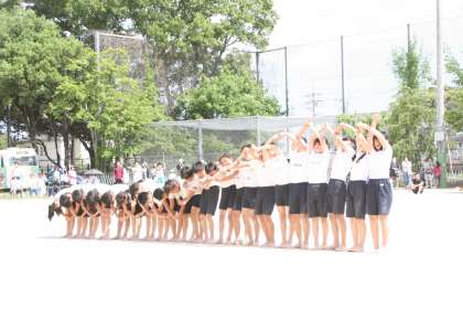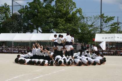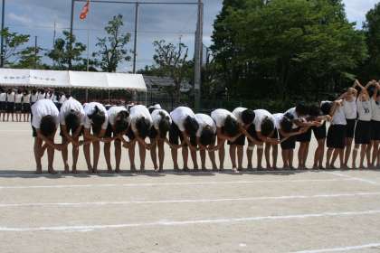 手をつないで,順に前に倒れたり後ろに倒れたりする技も