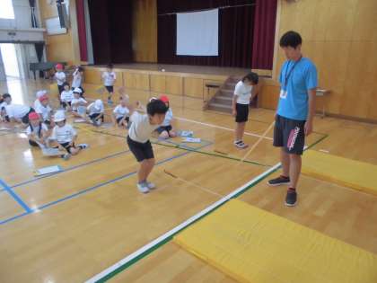 今回は4年生と一緒に,立ち幅跳び,長座体前屈,反復横跳び,上体おこしの4種目に取り組みました。