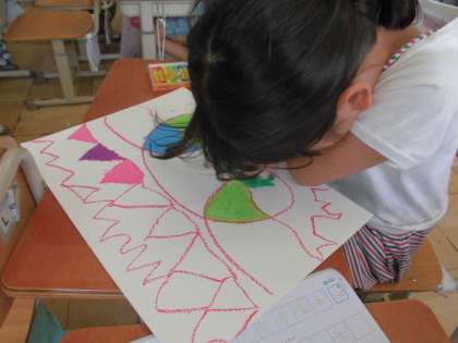 まずクレパスで ぐるぐるかいたり まっすぐかいたり かくかくかいたりします。