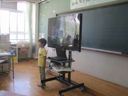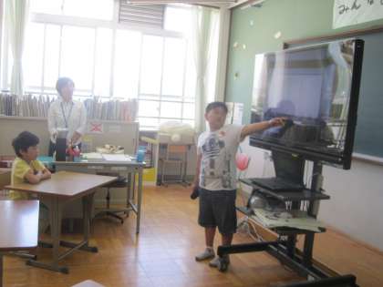 3人の児童が,プレゼンを使いながら,