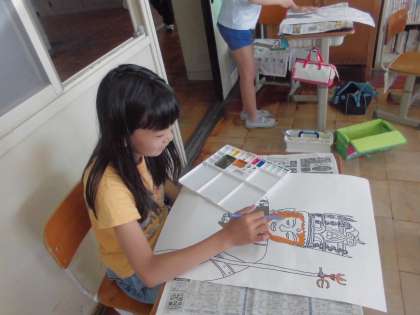初めて仏像を描く子がほとんどなので,荒々しい姿や穏やかな表情などを表現するのに,目や口,髪型,頬などを工夫を重ねています。