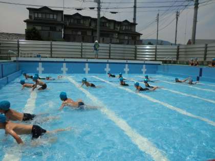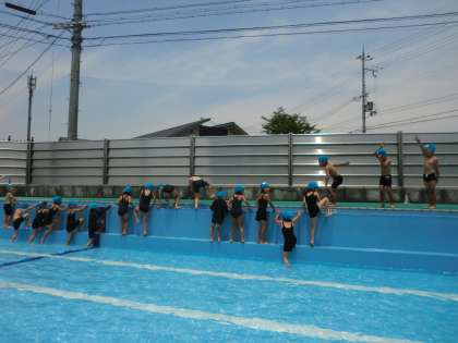 小学校に入学して初めてプールに入りました。「プールが楽しみで朝早く起きちゃった!」と話す子もいたほど,みんな今日のプール学習を楽しみにしていました。シャワーの仕方,バディの組み方,プールへの入り方…たくさんのことを今日はみんなで確認しました。ぐるぐるプール探検にワニ歩き…大喜びで水とのふれあいを楽しんでいました。暑い日だったので冷たい水がとても気持ちよかったです。次のプール学習の日も晴れますように!