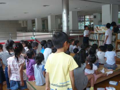 1年生や2年生を中心に50人ぐらいの人が集まって,読み聞かせを楽しみました。