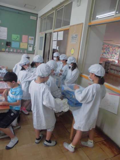 2年生の給食準備の様子。