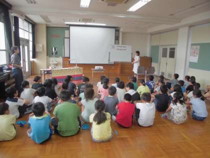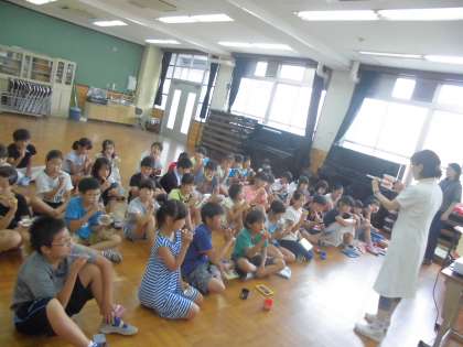 虫歯のこわさが伝わり、真剣に聞いていました。最後には、音楽に合わせてみんなで優しくブラッシング♪ 白くて美しい歯は美人・美男のもとですね★