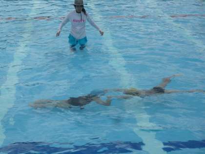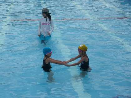 2年生に見本で伏し浮きを見せてもらったあと,2年生に手を持ってもらって,1・2年生で伏し浮きをしました。とっても上手に伏し浮きをしてくれたペアがありました。