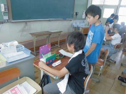 図工で取り組んでいたくるくるクランクが完成しました!今日はできあがった作品を実際に動かしてみて,友だちの作品の良さを見つけました。いろいろな工夫があって楽しかったですね!廊下に展示していますので個人懇談会のときに是非ご覧ください。