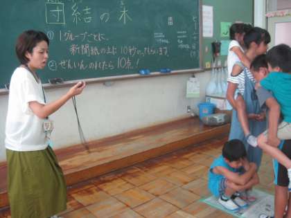 新聞紙の上に10秒間全員が乗っていられれば10点です。