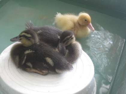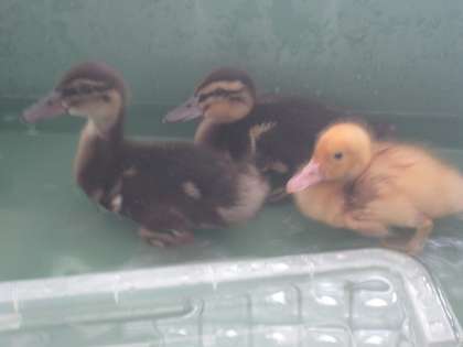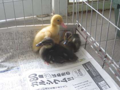 カモがつがいで2羽,アヒルが1羽