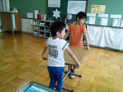 今日は夏休み明けで大そうじがありました。3くみの児童用机は少し大きいサイズで,学習や作業するのにとても便利なのですが,1人で運ぶのは大変です。そこで,机は2人で運びます。「○○さん一緒に運ぼう!」と声をかけあい,協力して大そうじを終えることができました。