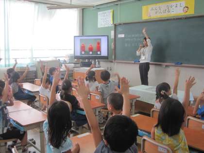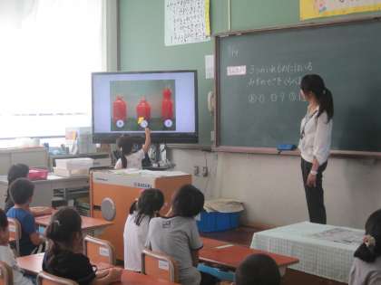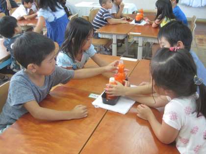 3つの容器に入る水のかさを,間接比較の方法で比べる。