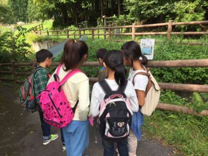 オリエンテーリングをやっています。写真はポイント7で,山の家近くの川にいる魚の名前を当てる問題があります。アマゴでしょうか,イワナでしょうか,それともアユでしょうか。グループで相談しながら問題を解いていきます。問題の得点と,どれだけ制限時間に近いかという時間得点で競います。各グループの「協力」が問われる活動です。