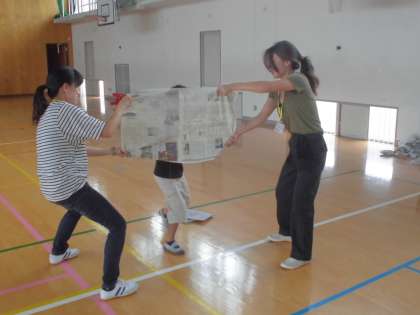 はじめに新聞紙突破リレーをしました。