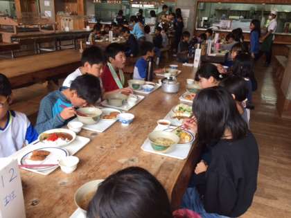 お昼はしょうゆラーメンか,カレーライスかが選べました。今日は,このあと野外炊事でハヤシライスを作るので,かなりの子がラーメンを選んでいました。
