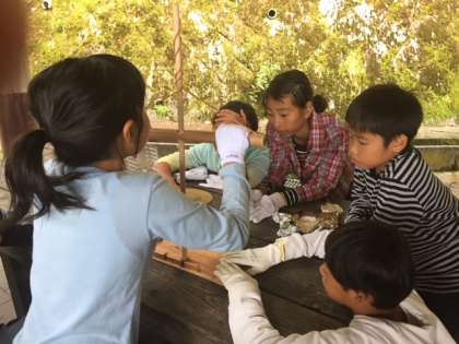火起こし体験をしました。マイギリ法というやり方で,火起こしの歴史では最も進化したやり方で挑戦します。ところが……なかなかうまくいきません。山の家の所員さんもかなり苦労されていましたが,みんなも各班ごとに挑戦です。やはりなかなか点きませんでしたが,一つ,二つと少しずつ点いてきました。