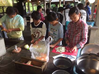 火起こしで点けた火を使って,野外炊事に挑戦です。どの班も協力して作り,おいしいハヤシライスになりました。