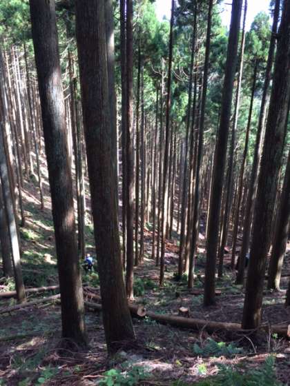 天狗杉からの帰り道,間伐の仕事をされているところに出会いました。間伐とは,森の木を切ったり,枝をはらったりして,明るくし,杜を健康な状態に保つための大切な作業です。また途中で琵琶湖も見えました。