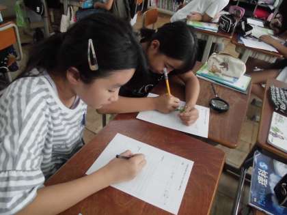 アサガオの花のつくりについて学習しました。そして、今日、花が咲く前と花が咲いた後のおしべとめしべはどうなっているのかを観察して、比べました。