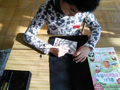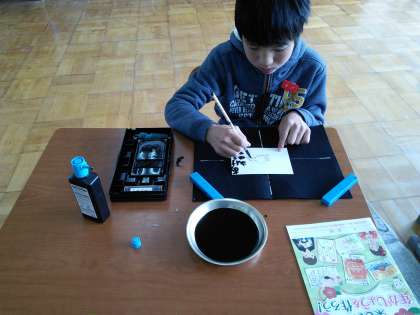 書写の時間に年賀状を書きました。『あけましておめでとう』と小筆で書いてから,墨汁に水を入れて,墨の濃淡を楽しみながら,おもいおもいの図案を描きました。素敵な年賀状ができました!