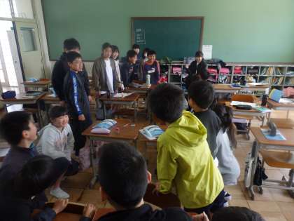 壮絶な試合に勝利したグループが,1年生の教室にお手伝いに行きました。