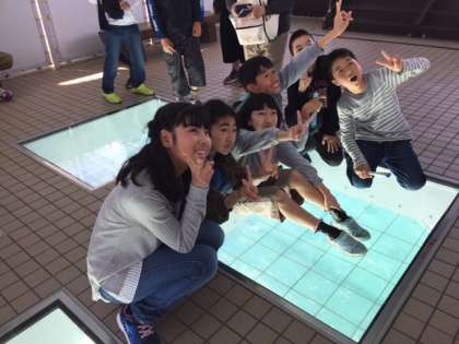 徳島県の「渦の道」を見学に行きました。鳴門海峡の上に突き出た施設の,足元がところどころ強化ガラスになっているものです。おそるおそる立ってみると……真下は海です。時間とタイミングによっては,海がまるで大きな川のようにザザーッと流れて,渦ができる様子が見られるのですが。今回は渦は見られませんでしたが,迫力満点の波の様子に,子ども達は感動していました。