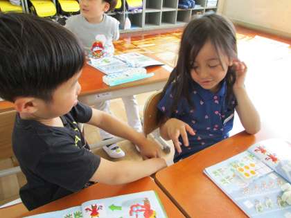 数図ブロックの数と数字を対応させながら,数の概念をつかむ学習をしています。