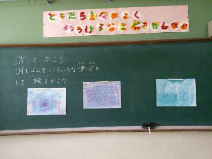図工『消してかこう』の続きです。前回に引き続き,消しゴムを使って絵をかいていくのですが,今回は画用紙を作るところからはじめました。色見本を見て,自分の描きたい画用紙になるように,色を決めてから,コンテの粉を画用紙にこすりつけて画用紙をつくりました。その後,消しゴムで,いろいろ描いていきました。「消しゴムの角を使うと細い線ができる。」「面を使うとふわふわってかける。」など,消しゴムの使い方でいろいろ表現できることを知り,どんどん消してかいていきました。