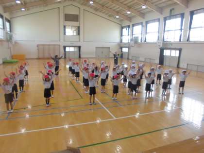 踊りをまず体育館で覚えました。お手本を見て 一生懸命踊りを覚えます。