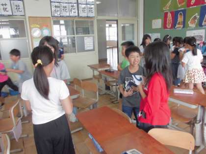 「What do you want?」と英語でコミュニケーションをとりながら,自分がもっっているアルファベットカードの半分をもっている相手を探しました。