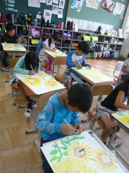 2年生はお話の絵「ひまわりと小人たち」の絵をかいています。