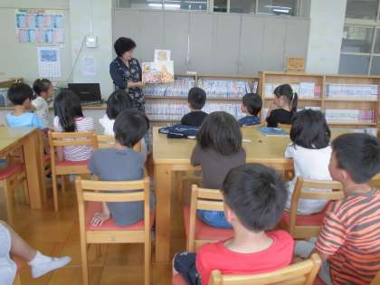 6月12日の図書の時間に,図書支援員の片上先生に絵本「いいから いいから」の読み聞かせをしていただきました。