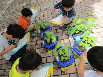 「おおきくなあれ」の気持ちをこめて,毎日の水やりを頑張っている1年生。