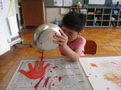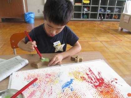 3くみの1年生では,図工で「スタンピング」をしています。プチプチシート,手形や動物の形をした用具などに,絵の具で色をつけてぺたぺた。色も好きな色を選んでいるので,色も重なって鮮やかになってきました。「何に見えるかな。」完成が楽しみです。