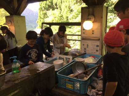 野外炊事の様子です。班で協力しながら,進めていきます。米をとぎ,野菜を切り,かまどに火を付けます。さあ!おいしいカレーができるかな。