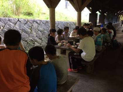 みんなで力を合わせておいしいカレーができました! リンゴジュースがまたよく合います。後片付けもテキパキとでき,お鍋やお釜もピカピカにしました。