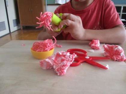 先日,5年生が紙粘土を使って,短いクレイアニメを作りました。その様子をよく見ていた1年生もクレイアニメを作ってみました。粘土を入れて押すと細長くなって出てくる用具が気に入り,「ラーメン」と言いながら楽しそうに作っている様子を,50コマ程度の写真を撮り,コマ送りにすると楽しいアニメになりました。「5年生にも見せたいなあ。」と声をかけると「うん」と笑顔がいっぱいでした。