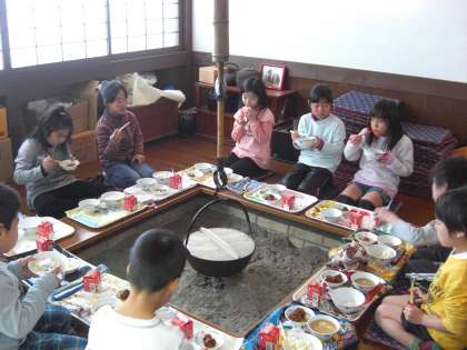 囲炉裏に火を入れてもらい,いろりを囲んで食べました。