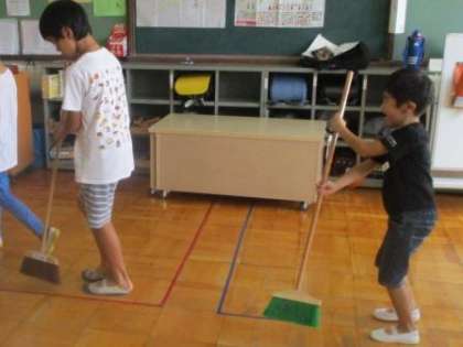 3組の掃除は自分たちで。4人で力を合わせて掃除をしています。特に,ほうきは床の線に沿って丁寧にはくことを意識しています。先日から,5年生が1年生にほうきを使った掃除の方法を教えている姿が見られるようになりました。「僕の後ろからついてきてな。」と手本を見せながら何度も繰り返しています。1年生も楽しそうです。子どもどうしの様々な関わりを通して,お互いにいろいろな力を身につけていってほしいと思っています。