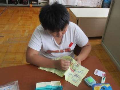 3組の5年生。家庭科で裁縫の学習に取り組んでいます。玉結びや玉どめの練習をした後,ボタンつけに挑戦。針に糸を通すところから,なかなか苦戦していた子どもたち,細かい作業ですが,粘り強く頑張る姿が見られます。うまくできると「できました」とほっと一息,嬉しそうな表情になります。裁縫は集中力が必要ですが,一つ一つ方法を身につけていってほしいと思っています。
