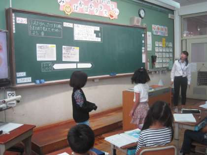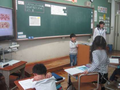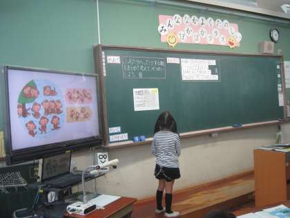 代表の児童がホワイトボードに自分の考えをかいて,