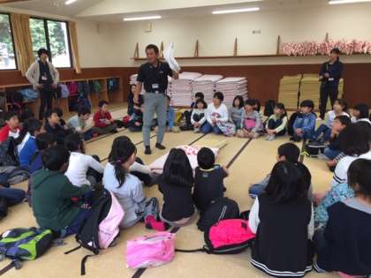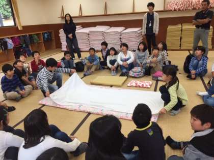 入所式のあとは60畳の部屋に入って,生活の仕方についてオリエンテーションを受けました。特にシーツや毛布は「みさきだたみ」と呼ばれ,一度覚えるといろいろなところで使えます。来年の「山の家」はもちろん,一般のユースホステルや公営のキャンプ場など約二たつことも多いです。そして,写真の後ろに写っているように,四スミをきっちりと美しく,次の利用者につなぎます。オリエンテーションでは所員さんの説明のあと,代表の児童に体験してもらいました。今晩全員がするので,しっかり見ておかないといけません。