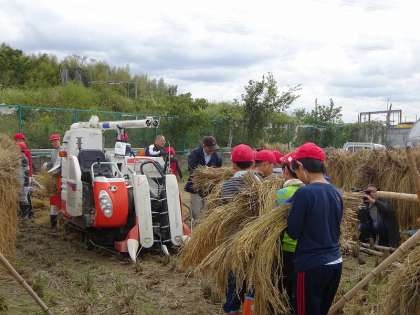 12日,地域の方のご協力のもと,刈り取った稲を脱穀しました。脱穀したお米を袋詰めする様子も見せていただきました。