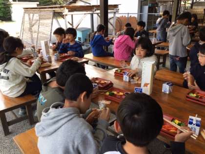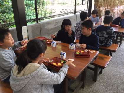 二日目の朝食です。今日一日の活動のためにモリモリ食べました。場所は野外炊事場です。