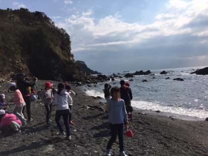 みさきの家から一番近い海岸の宮崎浜まで散歩に行きました。夏場だと磯浜観察などを行うのですが,もう水も冷たいので,今日は海岸散歩です。この辺りも台風の被害で護岸がかなり壊れたそうです。朝の集いの時にも,所員さんから,台風時に潮風が強く吹いて,植物が枯れてしまったお話をしていただきました。こうして穏やかな海を眺めながらひとたび自然の脅威にさらされると恐ろしいんだなと改めて思いました。