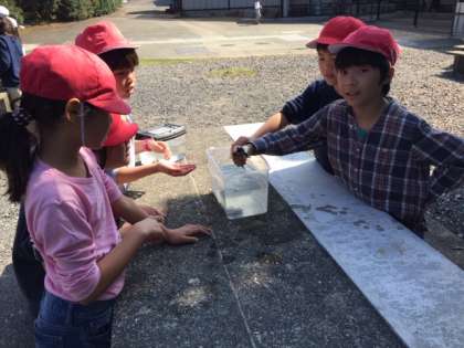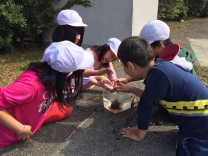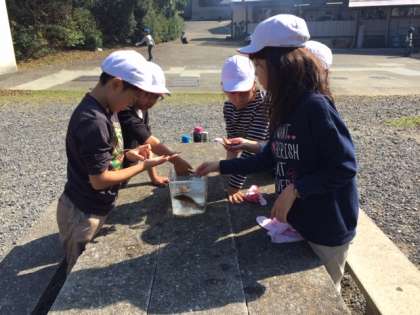 かご漁で獲れた生き物をケースに移してグループで観察します。さわっても良い生き物もいたので,みんなキャーキャー大騒ぎでした。