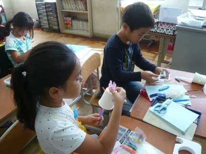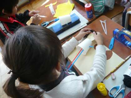 みんなで一緒にストローの仕組みを作り,そのあと各自がイメージを膨らませて作品に仕上げていきます。
