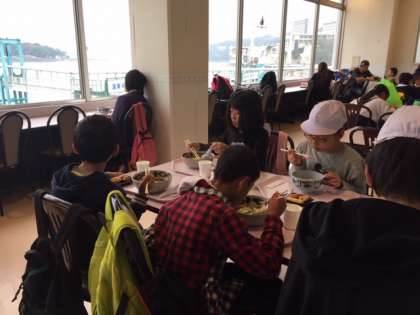 お昼は水族館の中のレストランでグループごとに食べます。混んでいたのであいている席を見つけるのがやっとでした。ラーメン,チャーハン,カレー,伊勢うどんの四つから選べました。