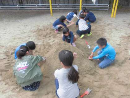 先日,どんな苦労があったのかを考えるために,砂山をつくりトンネルほりを体験しました。